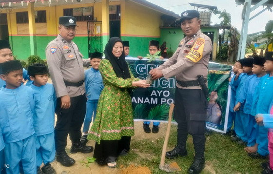 BAGAN SINEMBAH, ROKAN HILIR — Kapolsek Bagan Sinembah, Polres Rokan Hilir, AKP Bonardo Purba terus mendorong implementasi Program Green Policing di wilayah hukumnya melalui aksi nyata yang dilaksanakan oleh jajaran personel Polsek Bagan Sinembah. Salah satu bentuk komitmen tersebut diwujudkan melalui kegiatan sosialisasi Green Policing sekaligus penanaman bibit pohon di Madrasah Ibtidaiyah (MI) Yayasan Masjid Annur, Bagan Batu, Kecamatan Bagan Sinembah, Jumat (9/1/2026) sekitar pukul 09.30 WIB.