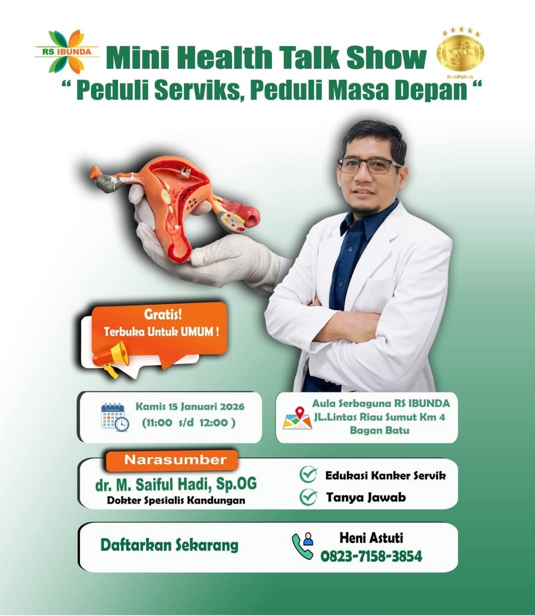 Rokan Hilir , AkuratNewsTV– Rumah Sakit (RS) Ibunda kembali menunjukkan komitmennya dalam meningkatkan kesadaran kesehatan perempuan dengan menggelar Mini Health Talk Show bertajuk “Peduli Serviks, Peduli Masa Depan”. Kegiatan edukatif ini akan berlangsung Kamis, 15 Januari 2026, pukul 11.00–12.00 WIB, di Aula Serbaguna RS Ibunda, Jalan Lintas Riau–Sumut Km 4, Bagan Batu.