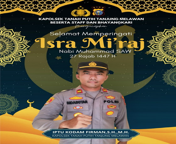 ROKAN HILIR — Kapolsek Tanah Putih Tanjung Melawan, IPTU Kodam Firman Sidabutar, S.H., M.H., bersama staf dan Bhayangkari menyampaikan ucapan Selamat Memperingati Isra Mi’raj Nabi Muhammad SAW 1447 Hijriah, yang diperingati pada 27 Rajab 1447 H.