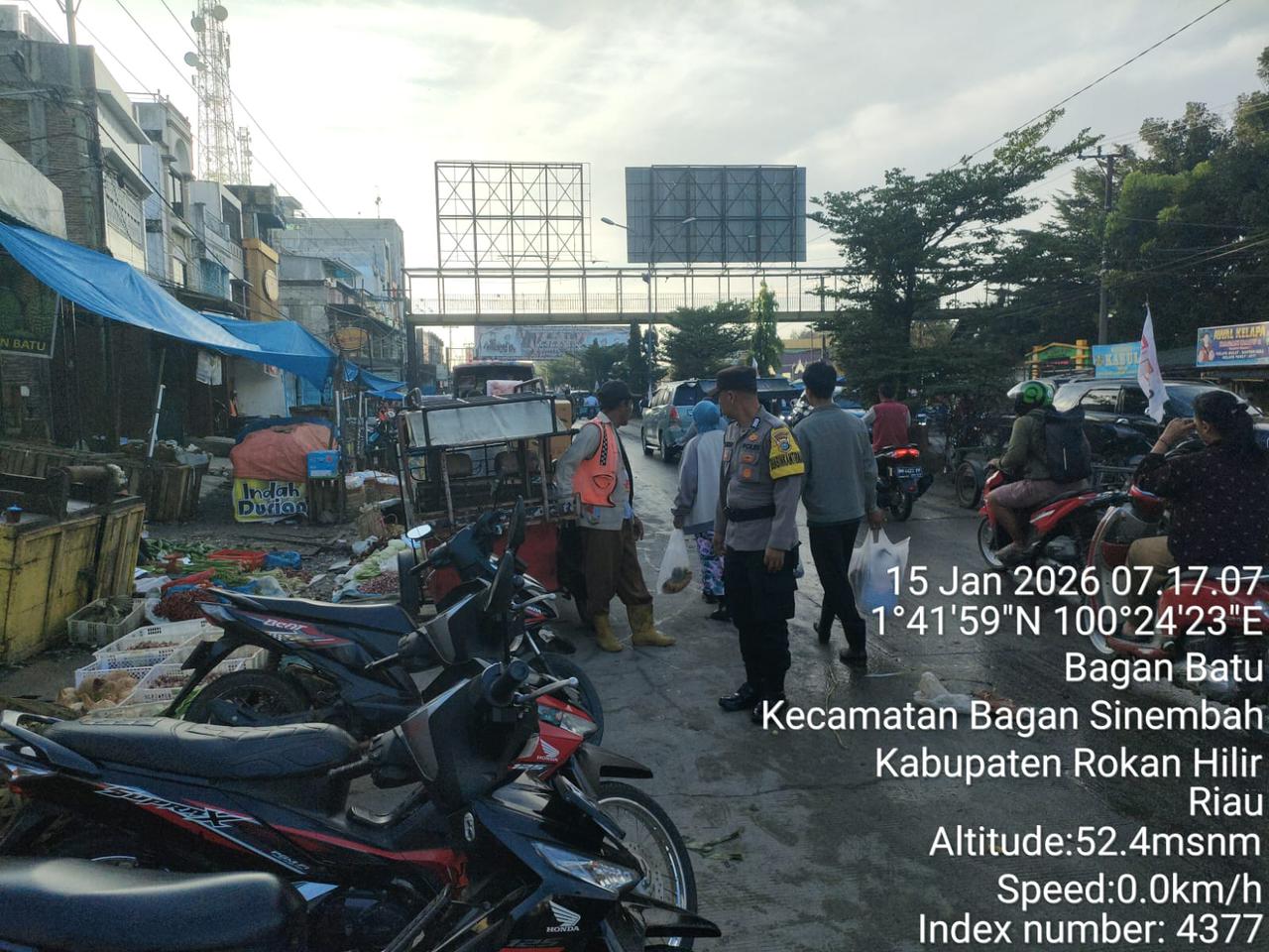 ROKAN HILIR, RIAU — Personel Polsek Bagan Sinembah melaksanakan kegiatan Strong Point pagi pada Kamis (15/1/2026) mulai pukul 07.00 WIB. Kegiatan tersebut difokuskan pada pengaturan arus lalu lintas di sekitar Jalan Jenderal Sudirman Bagan Batu dan kawasan U-Turn Pajak Lama.