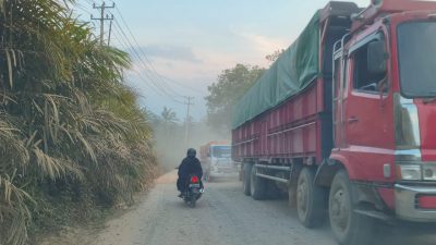 Debu pekat tampak beterbangan setiap kali truk pengangkut tandan buah segar (TBS) kelapa sawit, truk tangki CPO, hingga angkutan inti sawit melintas.