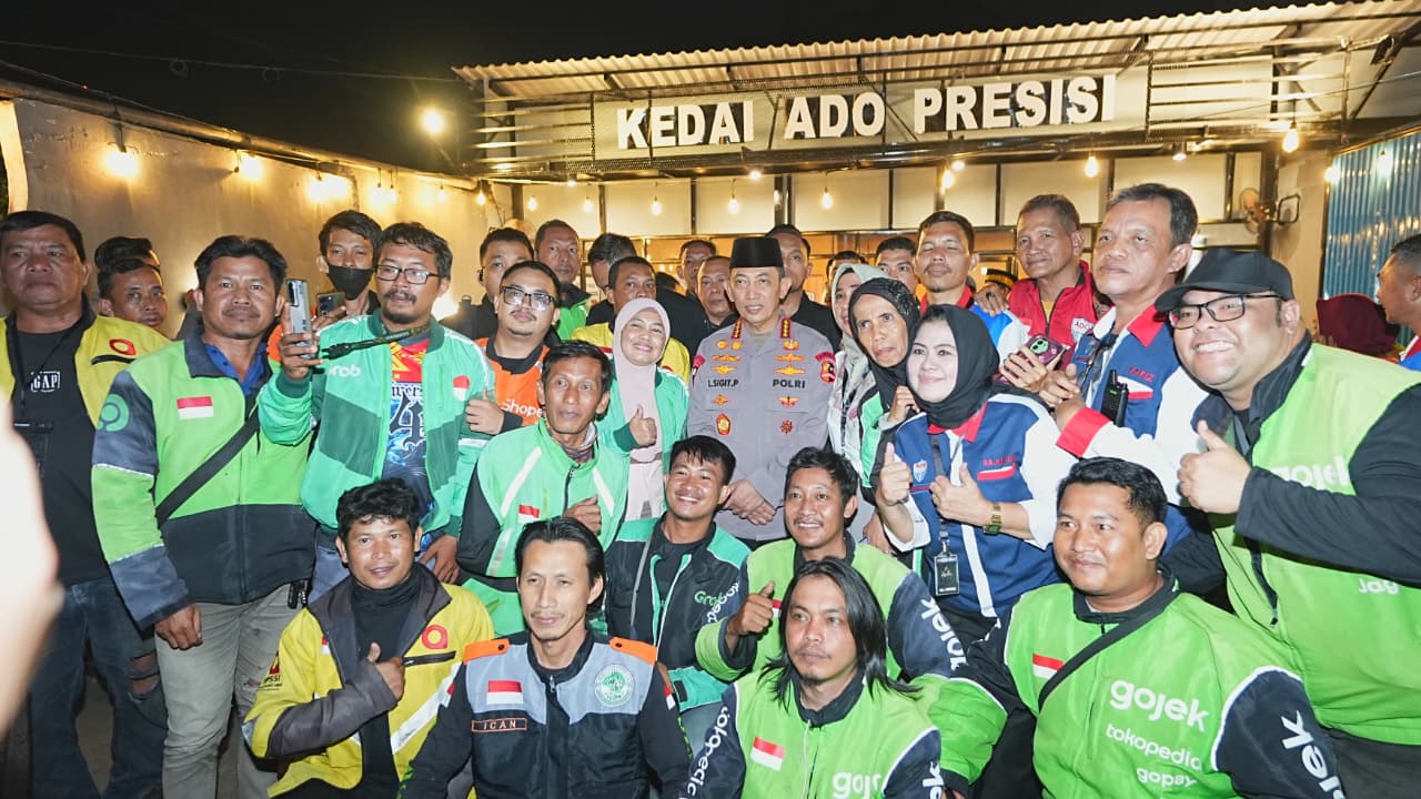 Kapolri tiba di Kedai Ado sekitar pukul 19.30 WIB dan langsung disambut oleh perwakilan komunitas driver online Palembang.