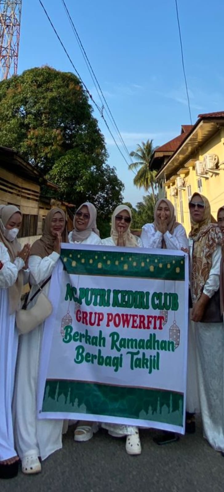 Para anggota Grup Power Fit terlihat antusias berdiri di tepi jalan untuk membagikan takjil kepada pengguna jalan yang melintas.