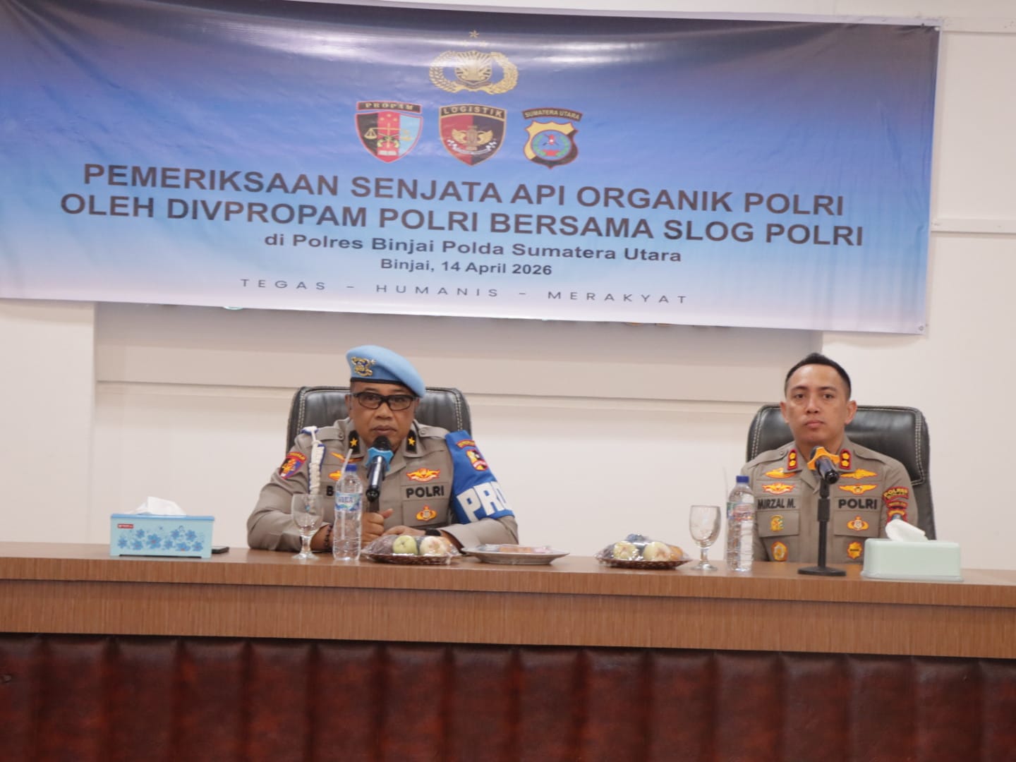 BINJAI | akuratnewstv.com – Antisipasi penyalahgunakan terhadap senjata api organik Polri, team Divisi Profesi dan Pengamanan (Divpropam) Polri bersama Staf Logistik (Slog) Polri melakukan pemeriksaan senjata api (senpi) organik yang dimiliki oleh Polres Binjai., Selasa (14/4/26).